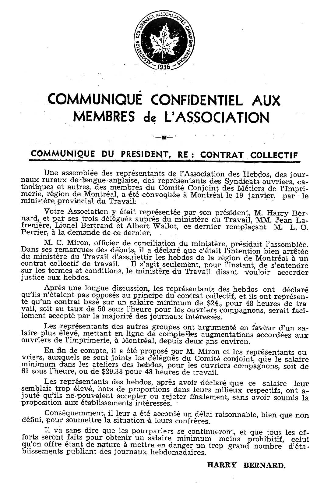 Un communiqué de Harry Bernard, président de l'Association des Hebdomadaires de janvier 1940