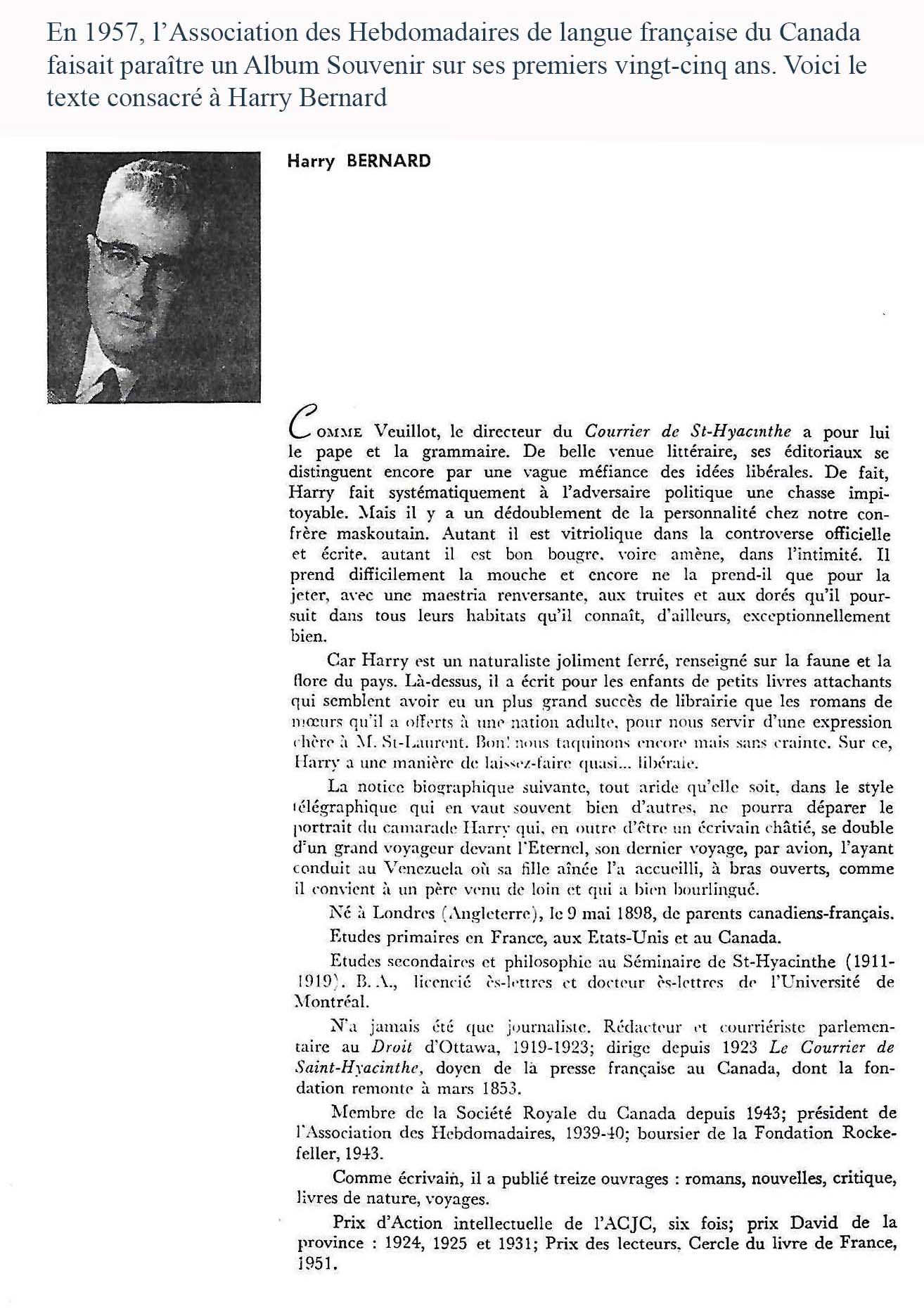 Une courte biographie de Harry Bernard rédigée par l'Association des Hebdomadaires de la langue française en 1957