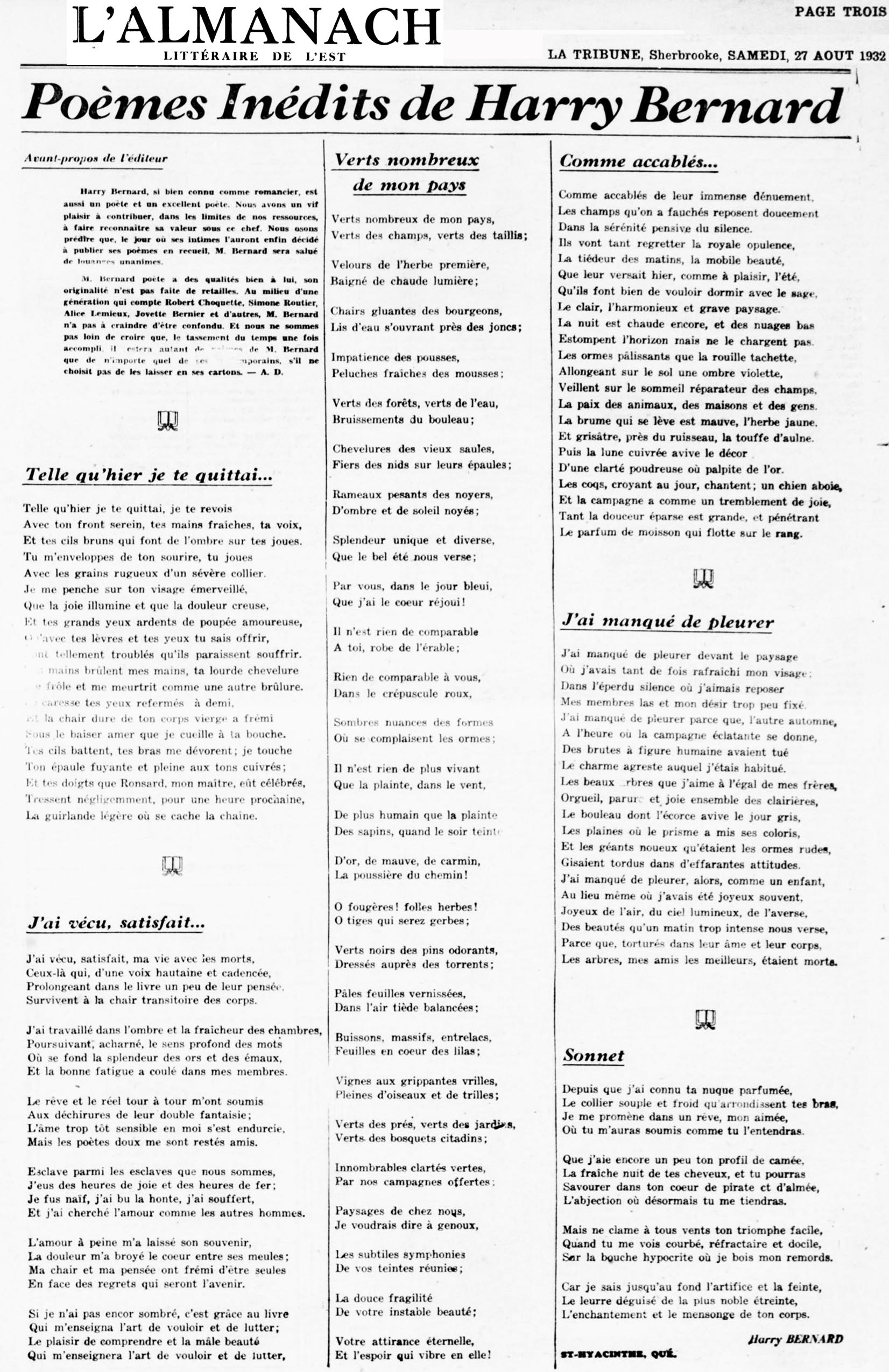 Alfred DesRochers fait paraître dans L'Almanach littéraire de l'Est de 1932 quelques poèmes inédits de Harry Bernard